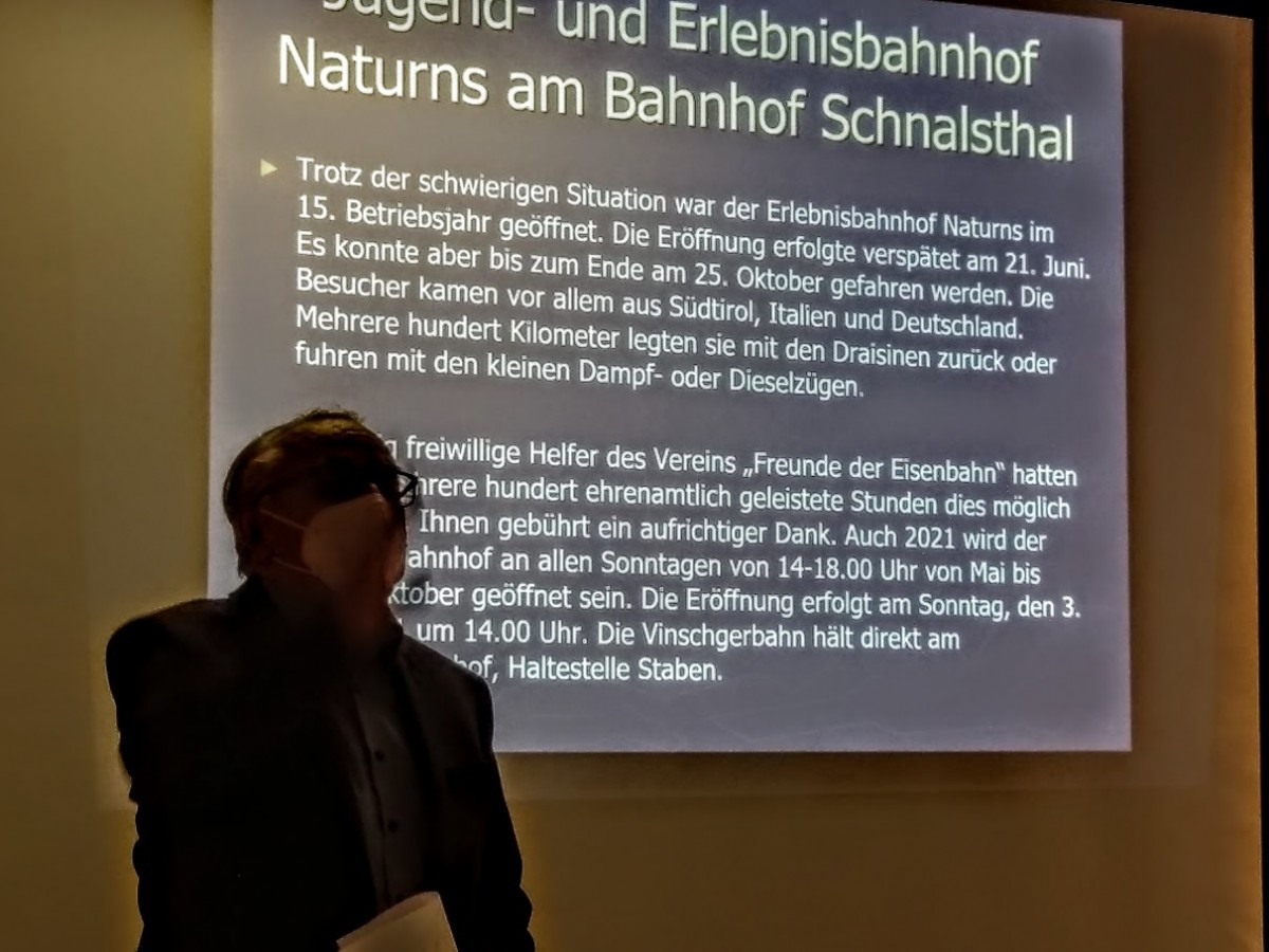 Aufgrund der Coronakrise konnten der Landesrat Daniel Alfreider und der Direktor der STA Joachim Dejaco nicht erscheinen und so fielen auch ihre geplanten Vorträge aus. Präsident Dr. Weiss blickte auf ein ungewöhnliches Jahr zurück. Trotz der Lockdowns und Einschränkungen konnte doch ein Großteil des Programms umgesetzt werden: so konnte z.B. der "Erlebnisbahnhof" eröffnet werden, wenn auch mit zeitlicher Verzögerung. Die deutschen Feriengäste blieben zwar aus, aber dafür kamen mehr italienische Familien. Die Eröffnung für 2021 ist für den 2. Mai geplant.