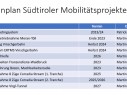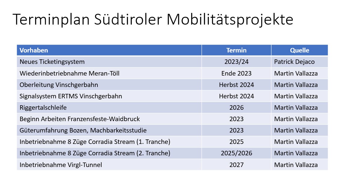 Folgende Infrastrukturprojekte sind in Umsetzung: Elektrifizierung Vinschgaubahn, Riggertalschleife, Haltestelle St. Jakob bei Bozen, BBT Baulos Zufahrtsstrecke Franzensfeste-Waidbruck. Die Mobiliätszentren Brixen und Bruneck sind in Fertigstellung. Zukünftige Projekte sind: Ausbau Meran-Bozen, Güterzugmfahrung Bozen, Zulaufstrecke BBT Unterland (nun in Bauleitplänen der Gemeinden), Ausbau Pustertalbahn, Mobilitätszentren Meran und Innichen. [Der Neubau des Bahnhofs Bozen wurde nicht angesprochen].
