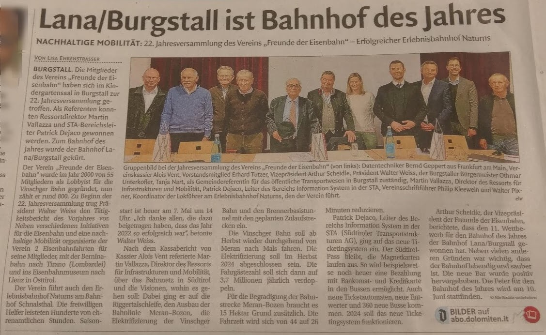 Burgstalls Bürgermeister Otnmar Unterkofler dankte für die Anerkennung duch Verleihung der Auszeichnung "Bahnhof des Jahres" durch den Verein Freunde der Eisenbahn und lud für den 10. Juni 2023 zur feierlichen Übergabe der Plakette am Bahnhof ein. Er erzählte auch, wieviel Finzierungskünste es gebraucht hat, um die Errichtung der Bahnhofsbar "km 23" zu erreichen. Auc die Wahl derzeitigen Pächterin erwies sich alsrichtig, sie ist nämlich als sehr tüchtig. Er machte geltend, dass alle Betroffenen über die geplanten Vorhaben bei der Auslegung des zweiten Gleises rechtzeitig informiert und in die Umsetzung mit eingebunden werden möchten und befürwortet den "technischen Tisch", der zum Zwecke des Informationsaustausches zwischen den Bürgermeistern des betroffenen Teiles des Etschtales und den Akteueren STA, RFI und Landesämtern eingerichtet worden ist.
