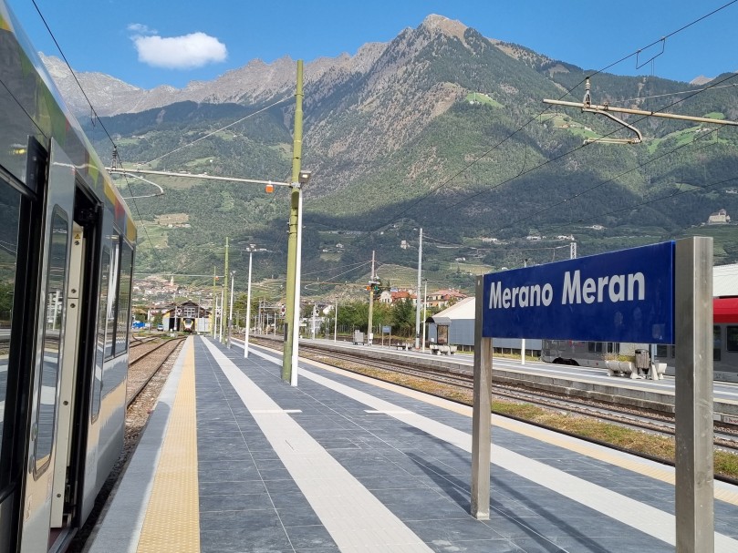 Vinschgerbahn auf den mittlerweile erhöhten Bahnsteigen in Meran.