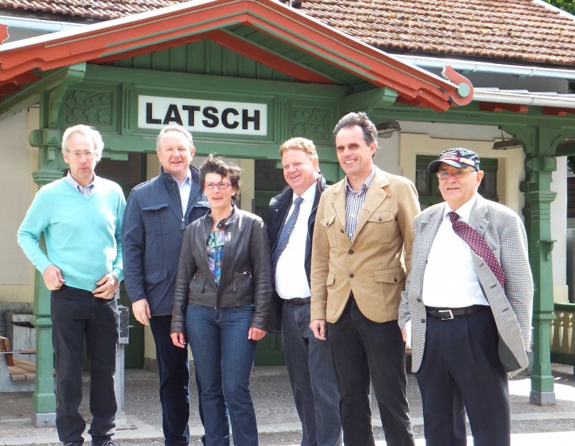 Am Samstag, dem 6. Mai fand in Latsch das 7. Geburtstagsfest der Vinschgerbahn statt. Musikalisch begleitet wurde das Fest von der Jugendmusikkapelle Latsch. Der Katholische Familienverband organisierte Spiele für die Kleinen und die Jugend verschönerte die Bahn-Unterführung mit kunstvollen Grafittis. Bei den Speisen gab der Apfel den Ton an und so gab es Apfel-Süßspeisen in allen Varianten. Auch Prominenz war reichlich zugegegen. Von links nach rechts: Gemeindereferent Hermann Kerschbaumer, Senator Manfred Pinzger, Gemeindereferentin Andrea Kofler, Bürgermeister Heidegger von Naturns, Landesrat Richard Theiner und der Präsident Walter Weiss vom "Verein Freunde der Eisenbahn". Von den Festaktivitäten ist im Bild nichts zu sehen, sie fanden auf dem Platz zwischen Bahnhof und Kulturhaus und auf der westlichen Bahnhofsseite statt..