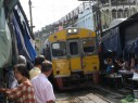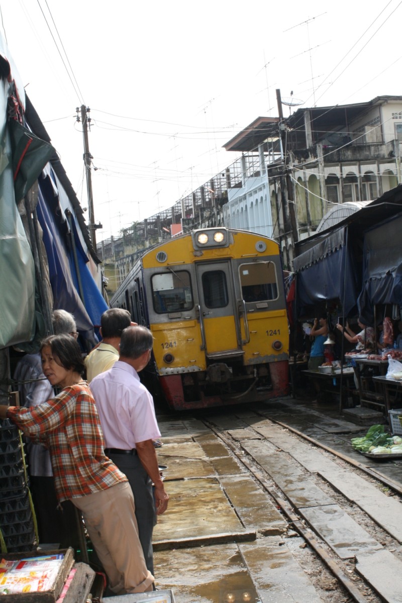 Ein besonderes Erlebnis war auch die Durchfahrt eines Zuges durch einen Markt in Samut Songkhram. Alle Stände und Waren werden kurzfristig weggeräumt und wieder zurückgestellt.