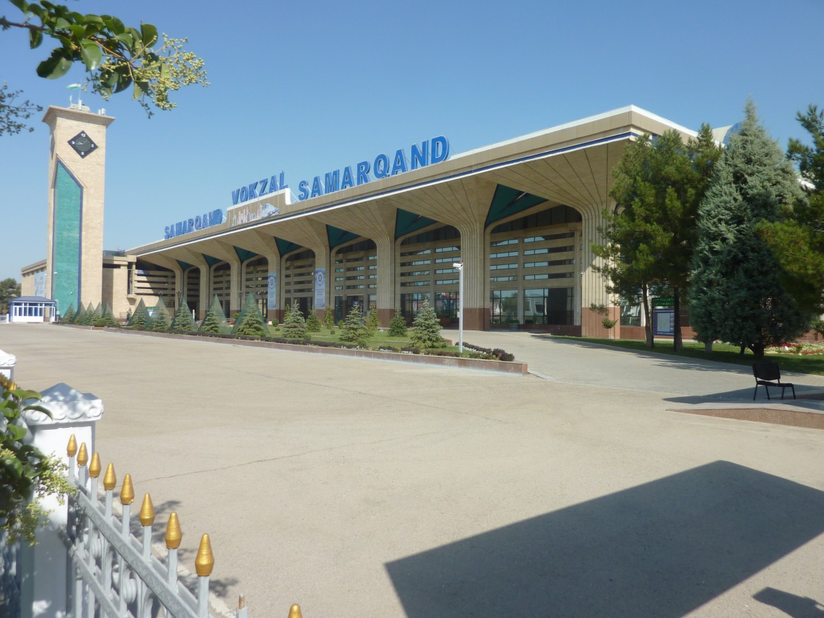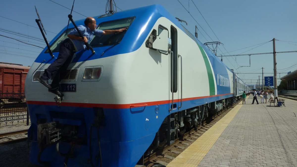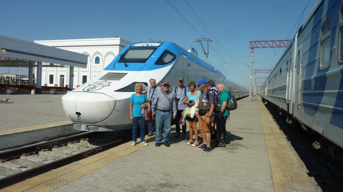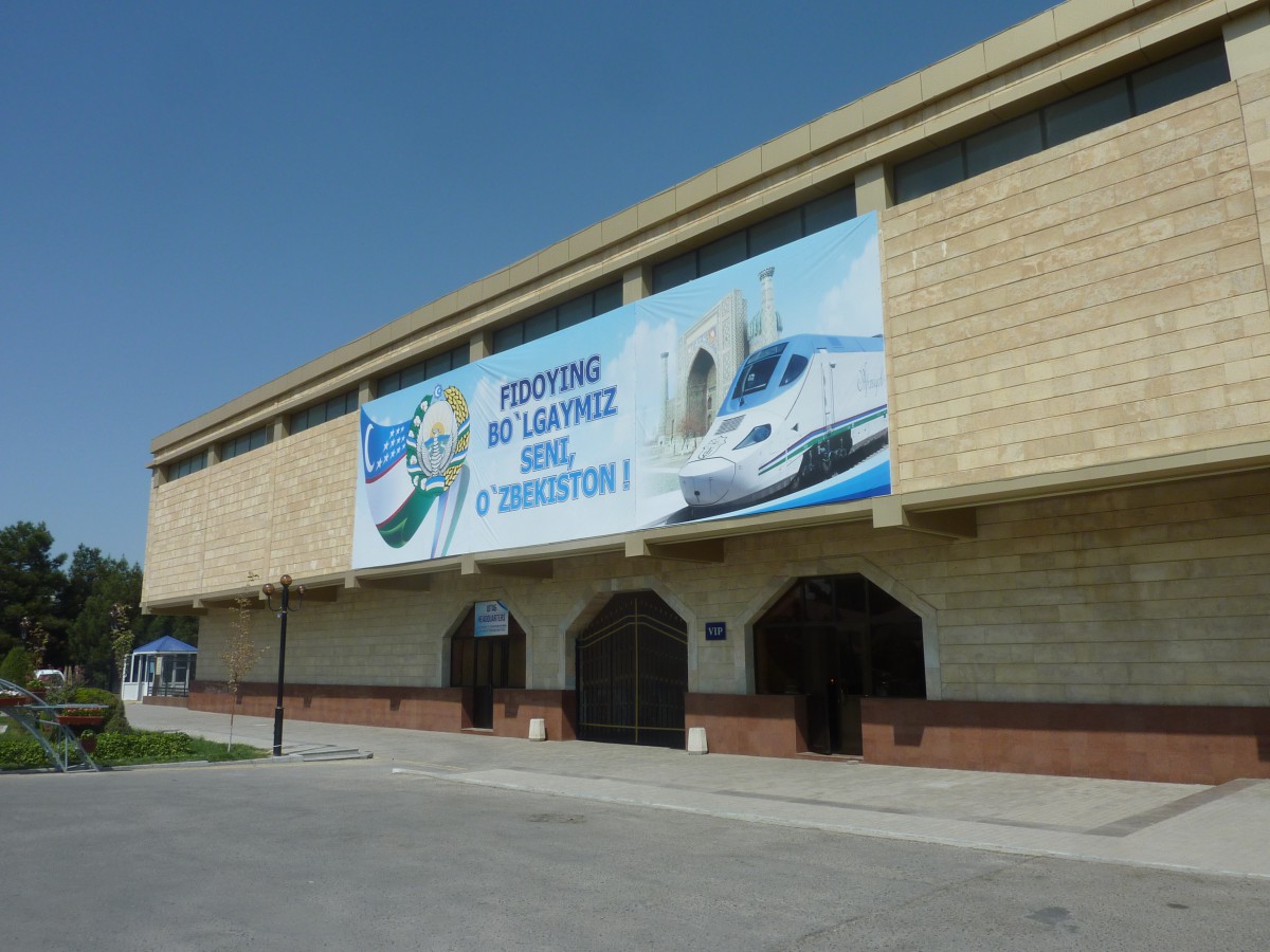 In Zeiten der Sowjetunion spielten die Grenzen zwischen den Unionsländern kaum eine Rolle – und Eisenbahnen sowie Straßen nahmen darauf keine Rücksicht. Nach dem Zerfall aber begannen sich die neuen Staaten aber gegeneinander abzuschotten. Um nicht durch ausländisches Territorium zu fahren, haben die Usbekischen Bahnen bis zu 500 km neue Strecken gebaut. Zwischen den drei größten – auch touristisch sehr interessanten – Städten Taschkent, Samarkand und Buchara fährt auf elektrifizierter Strecke der Afrosiab, ein neuer Qualitätszug der spanischen Firma Talgo. Auf bestimmten Streckenabschnitten ist er so schnell wie ein Railjet, nämlich 230 kmh (laut Anzeige im Waggon), in Zentralasien wohl ein einmaliges Tempo! Die Bahnhöfe, die wir besuchten, waren alles Großbauten aus der Sowjetzeit mit Türmen, großen Hallen, hohen Säulen und viel Marmor, allerdings neu restauriert und sehr sauber. Passagiere kommen nur, wenn die wenigen Züge halten. Früher gab es viel mehr Verbindungen, darunter zumindest im Sommer vier tägliche Züge nach Moskau, wenn ich mir das in einem alten Fahrplan von 1987 anschaue (heute nur einer und der 2x die Woche). Viele Reisende bevorzugen jetzt eben das schnellere Flugzeug. Andererseits wird auf vielen Plakaten und in vielen Präsentationen für die neuen, schnellen Zügen geworben. Und auf den Inlandsstrecken erobert ein komfortabler, schenller Zug mit gutem Service offensichtlich wieder Terrain zurück.