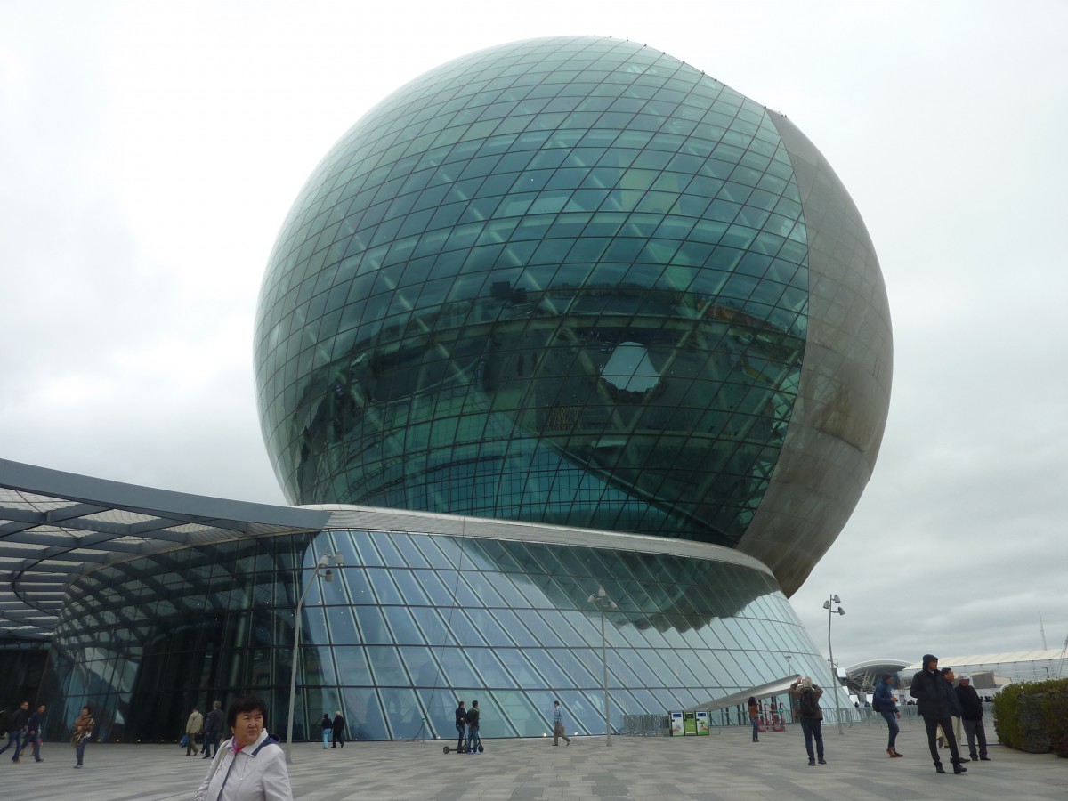 Die ersten beiden Tage verbrachte die 9-köpfige Gruppe in Astana, der neuen Hauptstadt Kasachstans. Ziel des ersten Tages war die EXPO mit dem Thema „Energie der Zukunft“. Spektakulär ist der kasachische Pavillon in Form einer mehrstöckigen Kugel, in der man auf einem Parcour unterstützt durch eine Vielfalt an multimedialen Effekten und Präsentationstechniken sich dem Thema nähern konnte. Drei Pavillons auf der Expo hat übrigens das Bozner Unternehmen Stahlbau Pichler errichtet. Jeder von uns hat neben der Kugel auch noch andere Pavillons besucht, einige z.B. auch den deutschen, der wegen seiner Gestaltung, die zum Mitmachen anregt, prämiert worden ist.