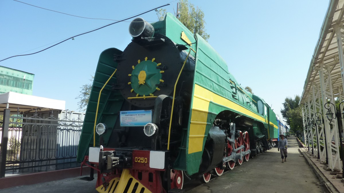 Etwas enttäuschend war das Eisenbahnmuseum von Taschkent, ein Freigelände nähe Bahnhof. Zwar gibt es dort eine Vielfalt an historischen Fahrzeugen, darunter gigantische Dampflokomiten. Zu sehen ist auch eine deutsche Dampflokomotiv den 1940er Jahren, die als Kriegsbeute ihren Weg bis nach Zentralasien gefunden hat. Interessanterweise hat es offensichtlich auch auf den Schienen der ehemaligen Sowjetunion doppelstöckige Aussichtswagen gegeben, denn ein solcher war ausgestellt. Bislang dachte ich, diese seinen nur in den USA und in Kanada im Einsatz gewesen. In konservatorischer und didaktischer Hinsicht wäre noch Vieles zu verbessern. Gläser z.B. wurden lediglich durch bemalte Bleche ersetzt. Die Führerin meinte, dass man eigentlich nur mit Kindern hierhergehe.