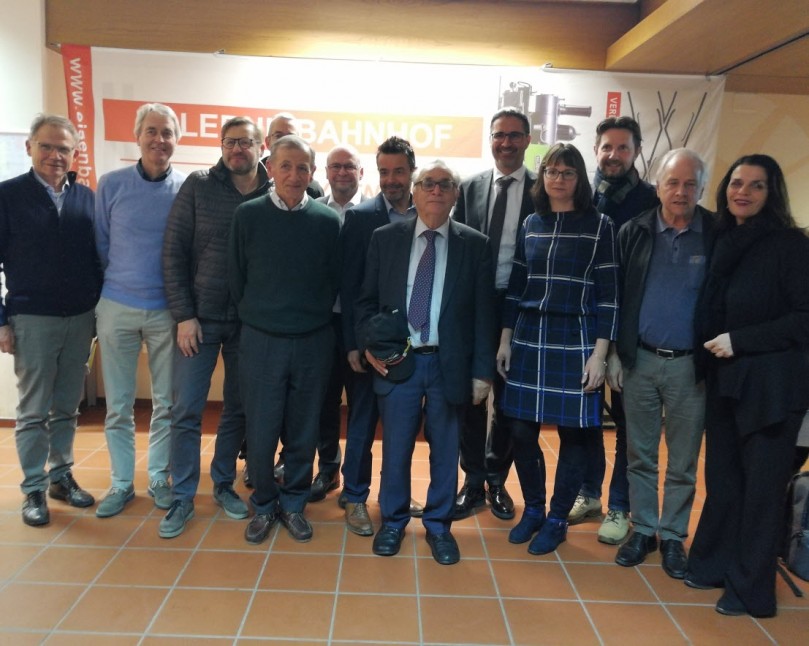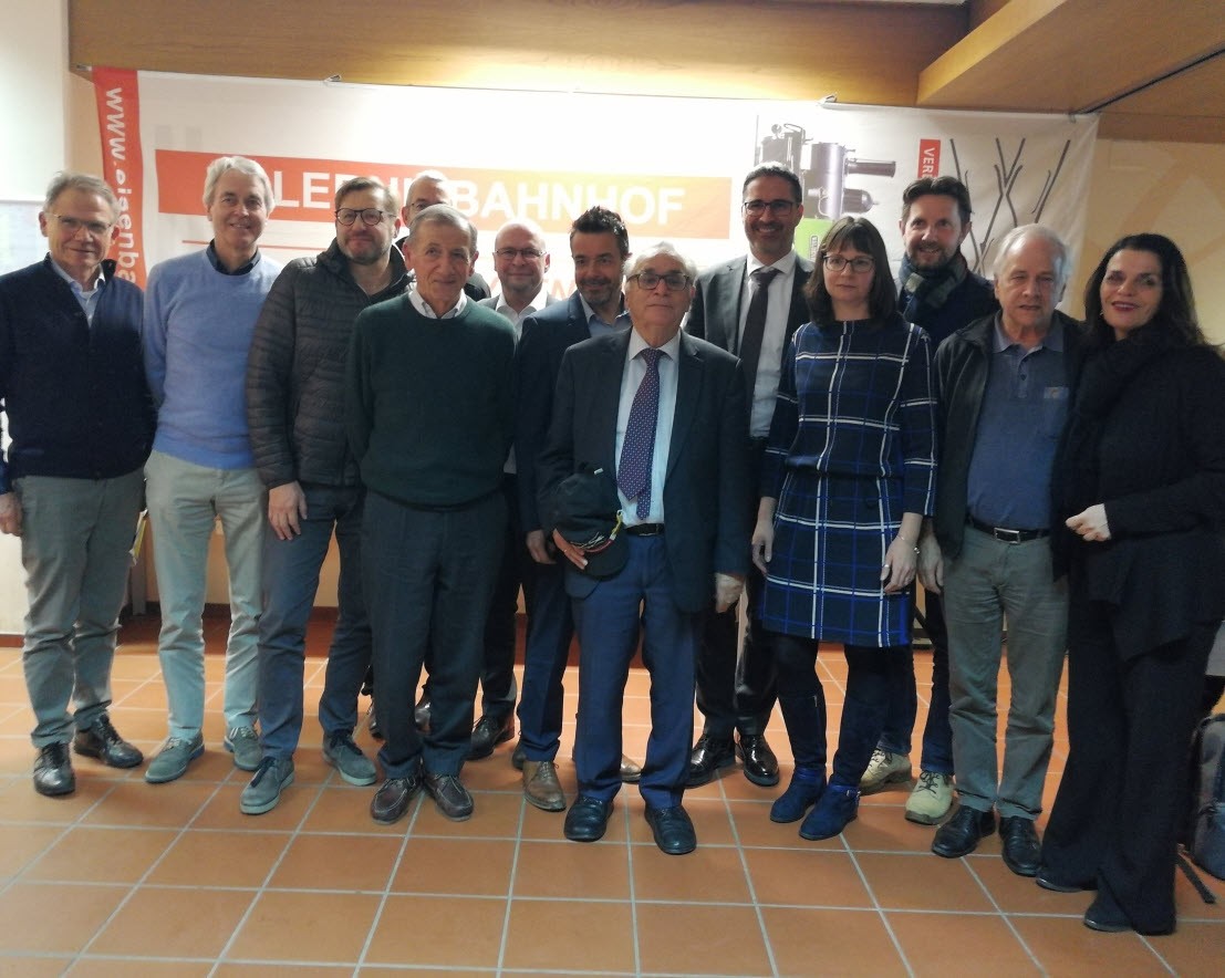 Im Bild: Von r. n. l.: S.Tutzer (Vorstandsmitglied), K. Bernhard (BM Prad), L. Fabi (GWR, Genossenschaft f. Weiterbildung und Regionalentwicklung, Spondinig), K. Runer (BM Terlan, im Hintergrund), A. Scheidle (Vorstandsmitglied, Jury "Bahnhof des Jahres", B-F. Geppert (Datenexperte), J. Dejaco (STA-Direktor), W. Weiss (Präsident), A. Kompatscher (Landeshauptmann), F. Mair (Vorstandsmitglied, Schriftführerin), Z. Christanell (Mitglied), P. Stopper (Verkehrsexperte Schweiz), A. Pichler (Vorstandsmitglied). Foto: Verein Freunde der Eisenbahn.