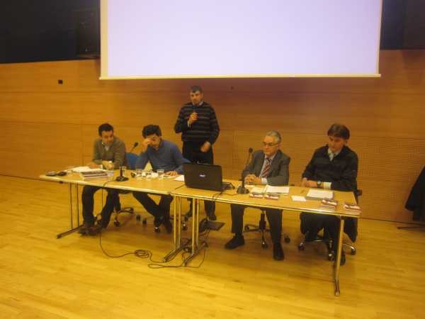 Auf dem Bild: Dr. Joachim Dejako , Direktor der STA, Moderator Matteo Ciangherotti, Radakteur des Adige, Stehend Massimo Girardi Präsident des Vereins Transdolomites, Dr. Walter Weiss, Präsident des Vereins Freunde der Eisenbahn, Helmuth Rainer, Sekretär des HGV Burgrafenamt.