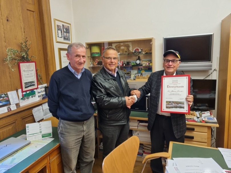 Höhepunkt war die Übergabe einer Ehrenurkunde an Dr. Johann Passler, der viele Jahre als Stellvertreter des Präsidenten im Vorstand sich besonders um die Eisenbahnfahrten ins Pustertal gekümmert hat und auch dieses Jahr bereit ist, am 27. August bei der Fahrt nach Lienz mitzuhelfen.
