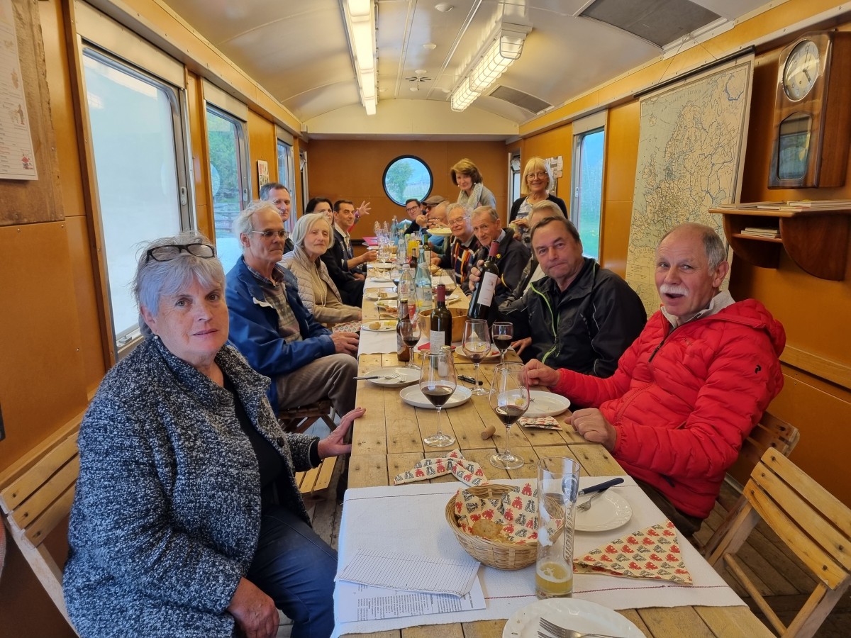 Foto unten : Kleine Feier im Postwaggon der Rhätischen Bahn mit Susanne Thurner und Alois Vent im Vordergrund, welche diese Feier organisierten.