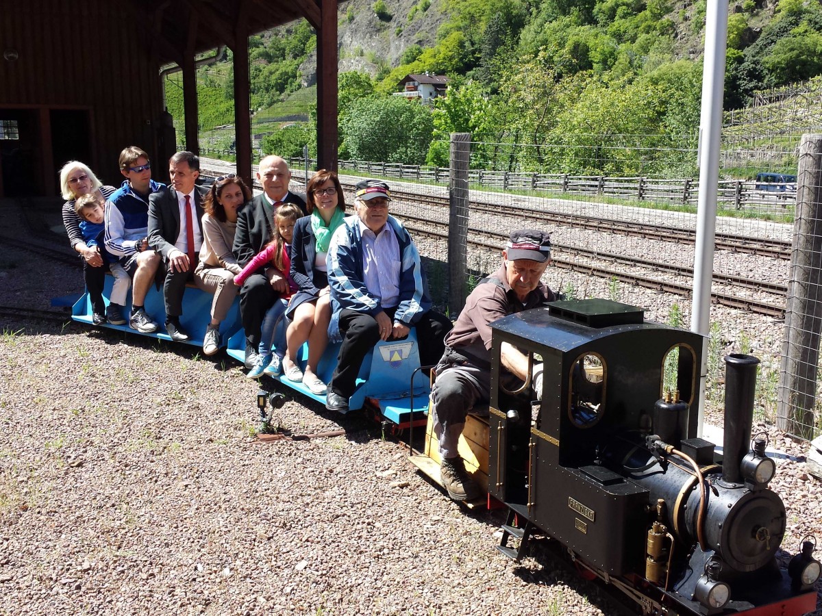 Darauf drehten drehten die Ehrengäste eine Runde. Hinter dem Lokführer (siehe Bild) nahmen der Präsident des Vereins, Walter Weiss, die Fahnenpatin, Birgit Theiner, der langjährige Landeshauptmann, Luis Durnwalder, mit den Patinnen Greta und Angelika, sowie Landeshauptmannstellvertreter, Richard Theiner, Gemeindereferent Zeno Christanell und die Freiwillige Helferin, Marlene Augsten mit ihrem Enkel, Platz.
