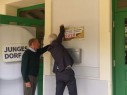 Nach den Ansprachen schraubten nun der Bürgermeister Bernhart und Arthur Scheidle in einem gemeinsamen "Kraftakt" unter Beifall das Schild "Bahnhof des Jahres 2020" an einer gut sichtbaren Stelle an der Bahnhofswand an.