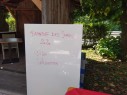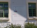 Ludwig Fabi von der Genossenschaft für Weiterbildung und Regionalentwicklung führte durch das Programm und lud nun zu einer Begehung des weiten Bahnhofareals ein, denn es gäbe da weitere Überraschungen. Der Weg führte über die neue Etschbrücke. Gleich dahinter die erste Station: eine zunächst noch mit einem blauen "Bildungsschurz" verkleidete künstlerisch gestaltete Bildungs-Wandtafel mit der Bezeichung "Vinschgauer Bildungszug". Frau Adeline Wallnöfer und Herrn Fabi enthüllten diese Installation effektvoll. Auf Tafeln sind nicht wenige Organisationen der Weiterbildung aufgelistet, welche in der Region tätig sind (und wie wir wissen im Bahnhof Sponiding ihren Sitz haben). Uns wurde auch der Sinn zweier weiterer "Impulstafeln" erklärt. Die Anregungen darauf lauten: "Verstrickt - weiter stricken!" und "Ausgewachsen - nochmals wachsen"!