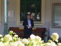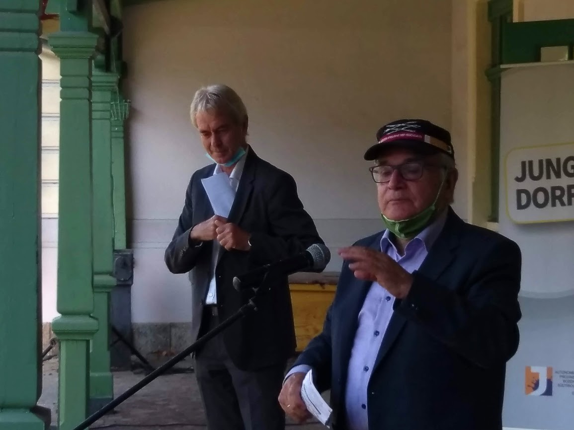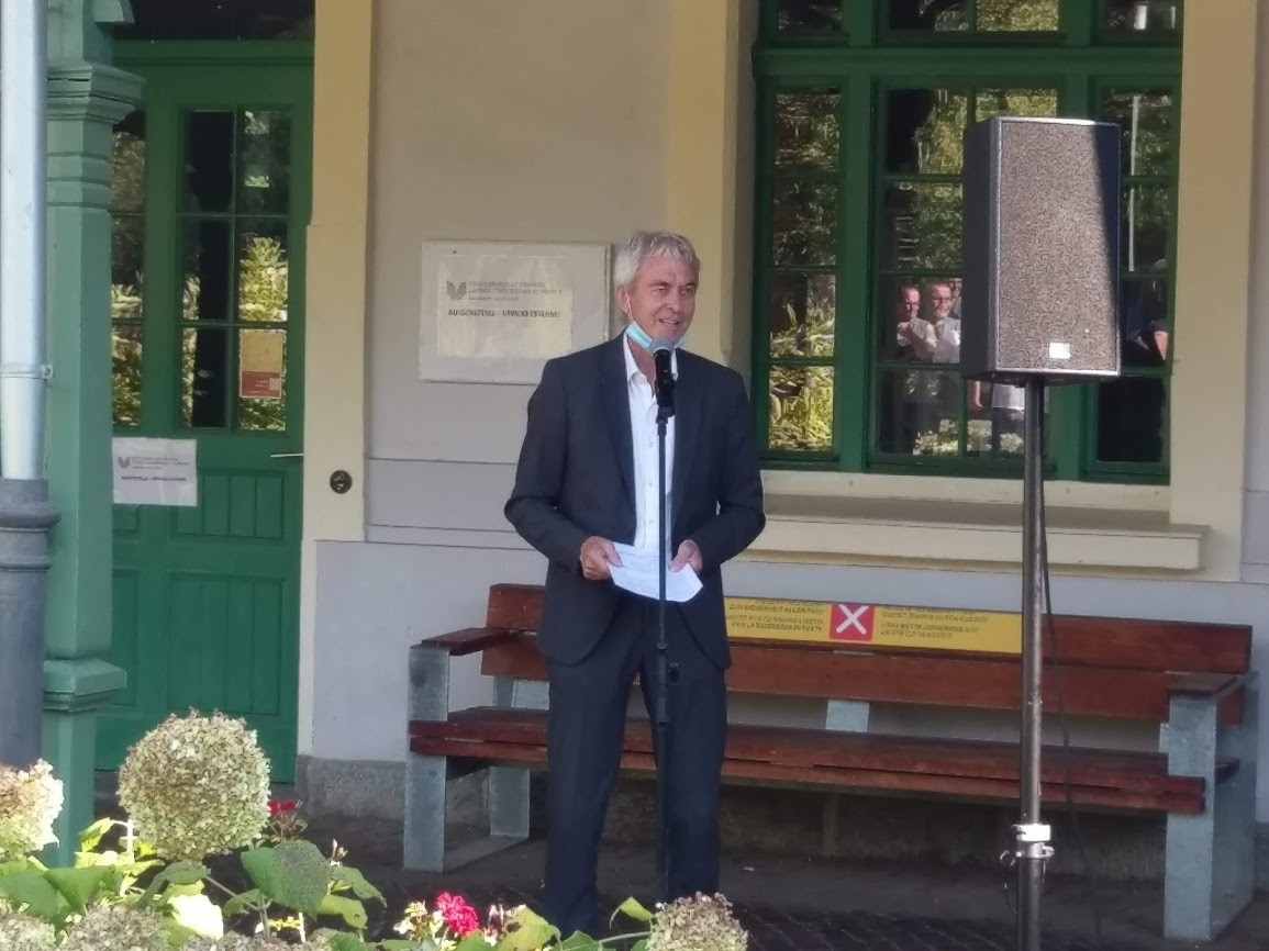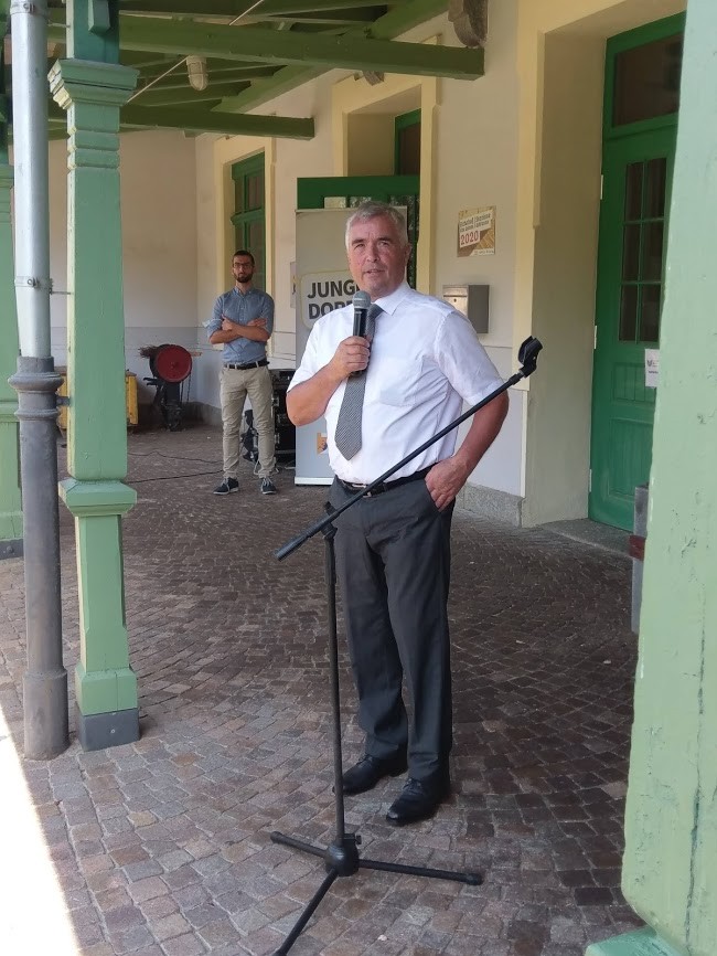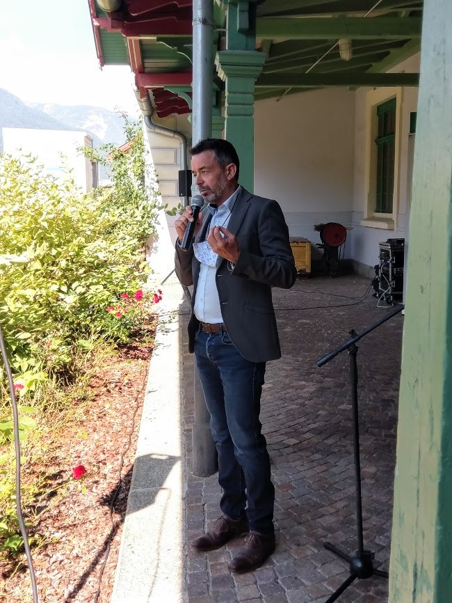 Der Bürgermeister von Prad, Karl Bernhart erklärte eingangs die besondere Geografie des Bahnhofgeländes: das Bahnhofsgebäude, die Gleisanlagen, die Bahnhofbar gehörten zur Gemeinde Prad, die Fahrradservicestelle im ehemaligen Güterschuppen, der neue Seminarraum und der Imbissstand hingegen befinde sich auf Spondiniger, letztendlich Schludernser Gebiet. Es sei auch der "offizielle" Bahnhof für das doch etwas entferter gelegene Bergdorf Stilfs. "Politisch gehören die Spondiniger zu Schluderns, postmäßig zu Prad und beerdigt werden sie in Eyrs bzw. in Schluderns", so erklärte Bürgermeister Karl Bernhart schmunzelnd die etwas komplizierte Situation der Spondiniger. Nichtsdestotrotz verfügen sie über einen der schönsten und größten Bahnhöfe an der Vinschger Bahnlinie.