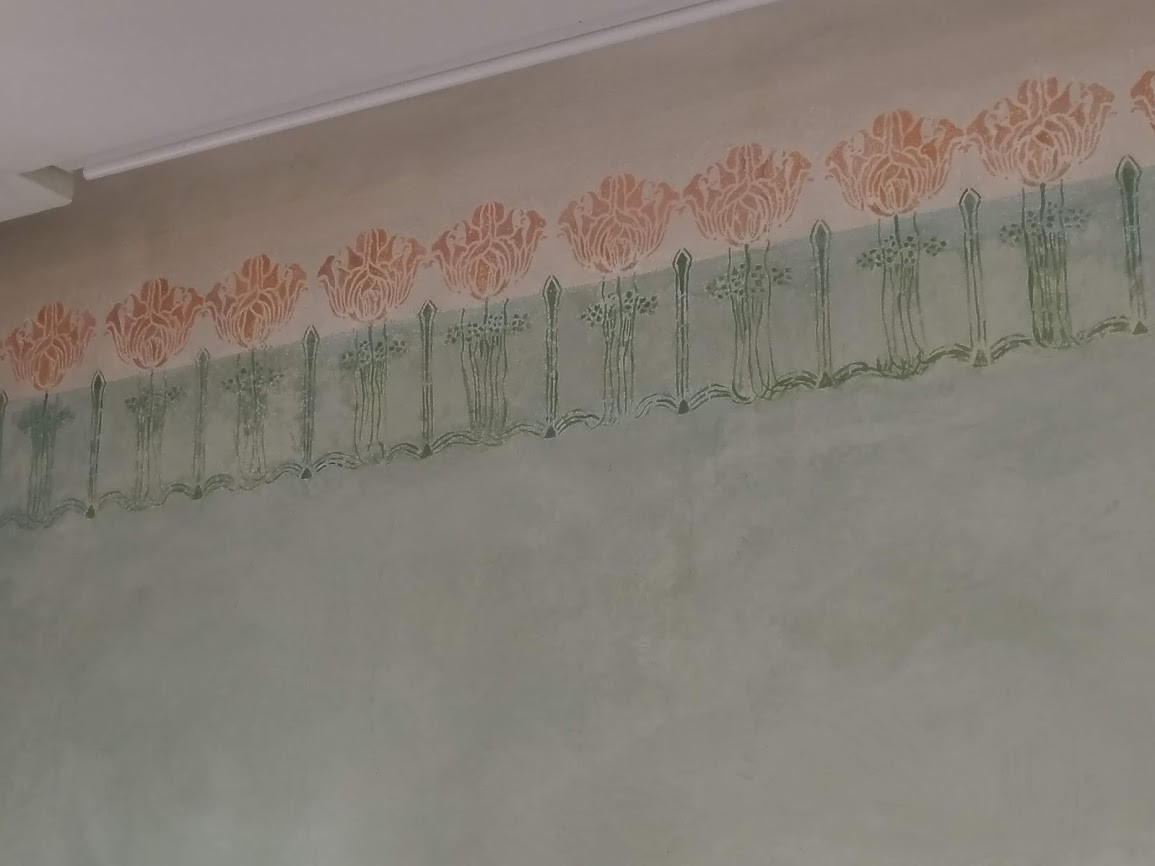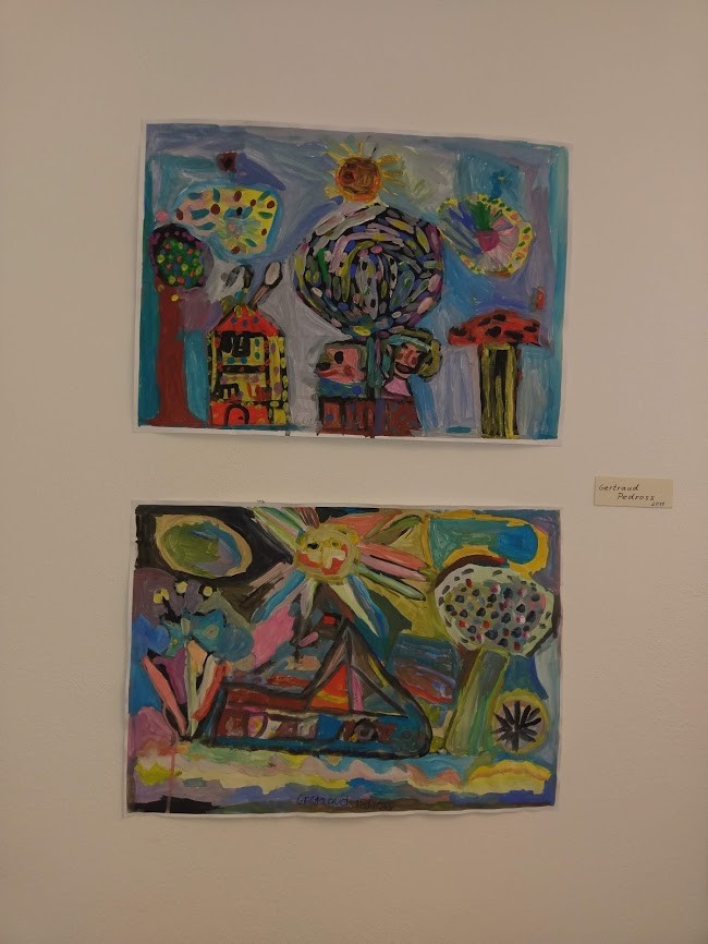 Schließlich führte uns der Rundgang zu einer zweiten Station, in den in einem Bahnnebengebäude (vermutlich die ehemalige Güterabfertigung, so der Autor) neu adaptierten Seminarraum. Zur Zeit läuft dort eine Ausstellung von Malereien und Zeichnungen der Künstlergruppe "ich+ich" des Hauses Slaranusa in Schlanders. Die Werke wurden Menschen mit besonderen Bedürfnissen kreiert im Rahmen eines Projektes der "Integrierten Volkshochschule Vinschgau", wie uns Frau Nadja Schwienbacher erklärte