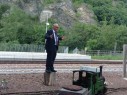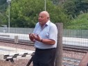 Präsident Walter Weiss, der Jubilar, der zur Feier eingeladen hatte, bestieg vor dem bereitgestellten Gartenbahnzug mit Dampflok einen Pflock und richtete von dort aus gewissermaßen von höherer Warte aus seine Worte an die Festgesellschaft.