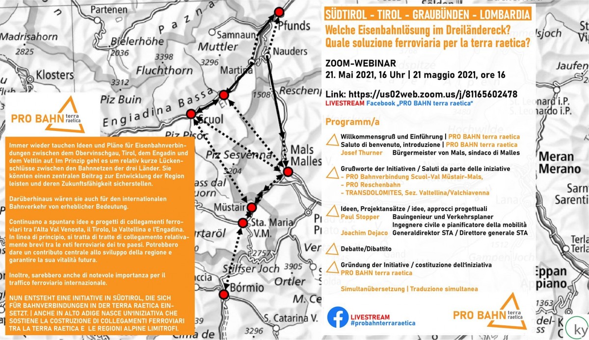 Immer wieder tauchen Ideen und Pläne für Eisenbahnverbindungen zwischen dem Obervinschgau, Tirol, dem Engadin und dem Veltlin auf. Im Prinzip geht es um relativ kurze Lückenschlüsse zwischen den Bahnnetzen der drei Länder. Sie könnten einen zentralen Beitrag zur Entwicklung der Region leisten und deren Zukunftsfähigkeit sicherstellen. Darüberhinaus wären sie auch für den internationalen Bahnverkehr von erheblicher Bedeutung.