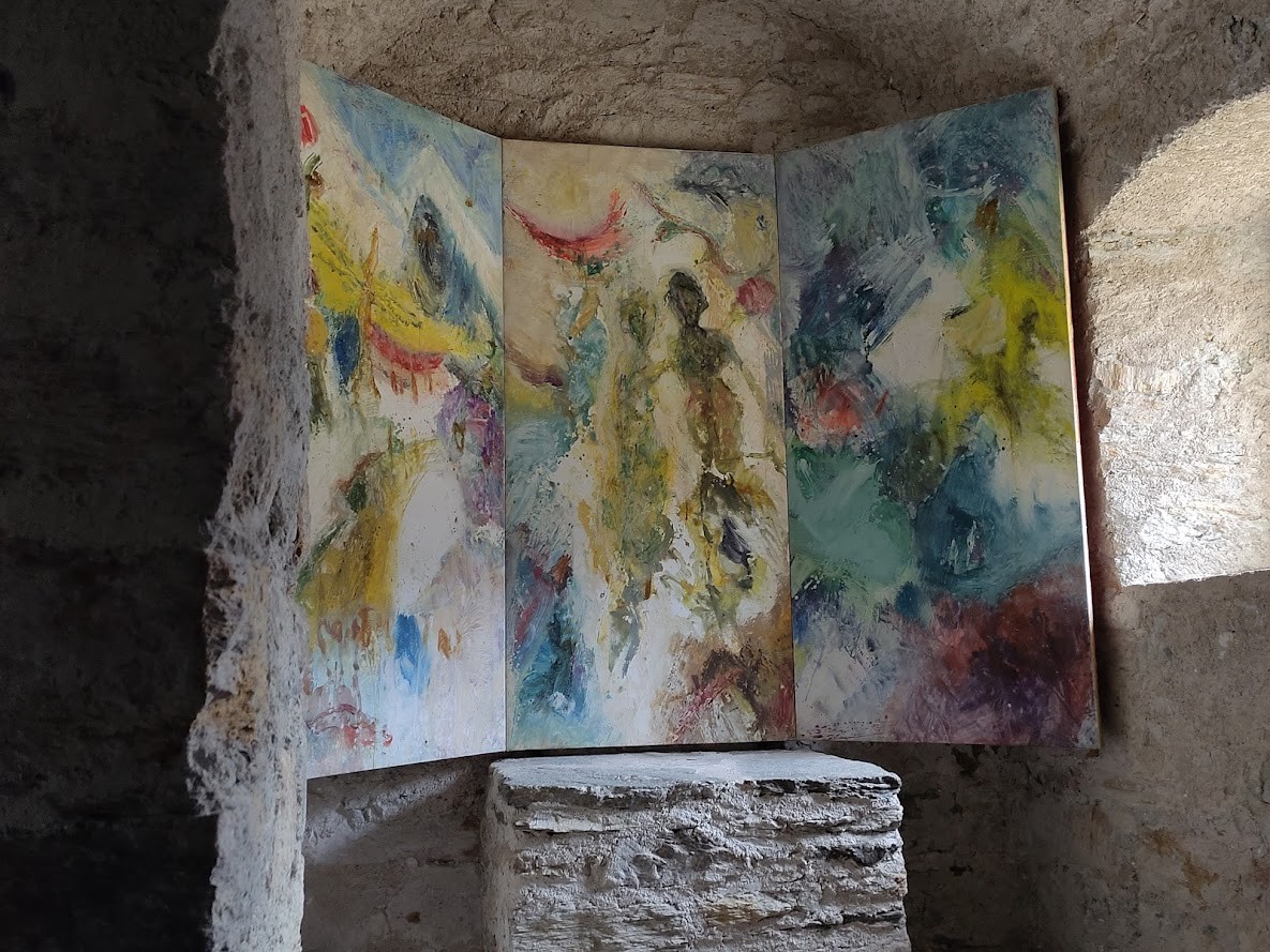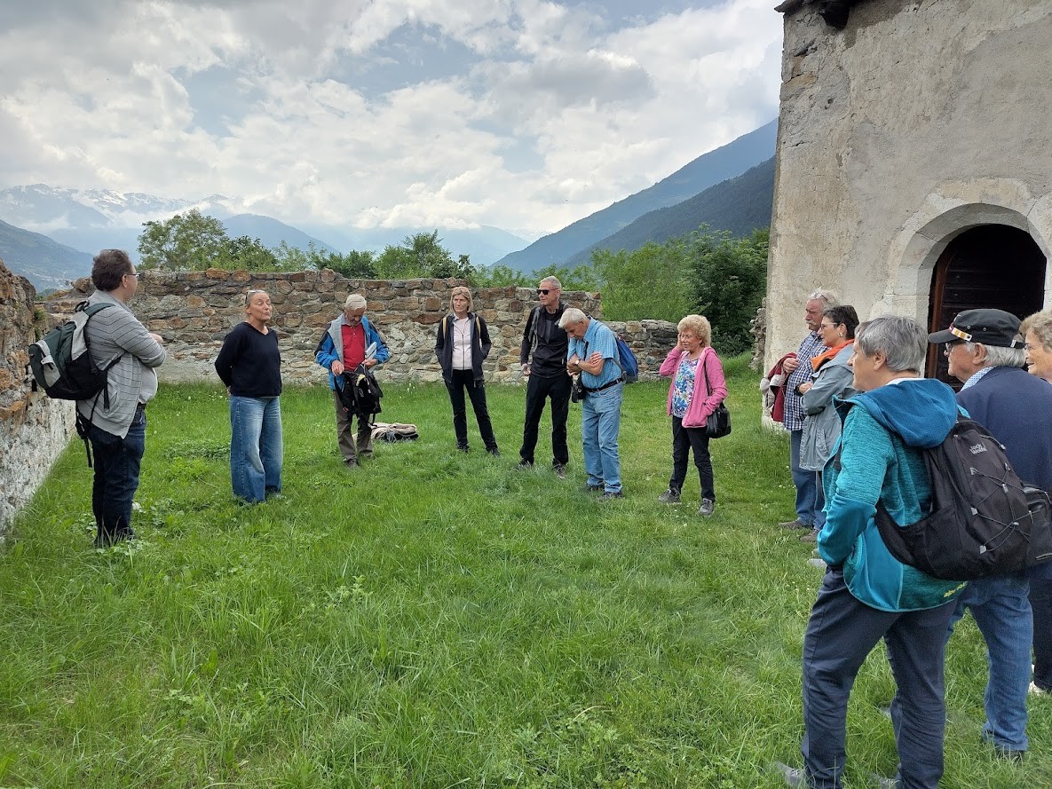 Vor dem außerhalb der Ortschaft frei stehenden Kirchlein St. Sisinius erwartete uns die Kunstkennerin Susanne Saewert, eine Bundesdeutsche mit starken Bindungen zu Laas, die uns die Entstehungsgeschichte dieser romanischen Kirche, eingefasst von einer Mauer erklärte. Sie ist Vertraute des Laaser Malers Jörg Hofer, der in jungen Jahren ein Tryptichon für diese Kirche gemalt hat, das wiederentdeckt nun in der Apsis ausgestellt ist. Es zeigt in moderner Malweise Motive aus der Schöpfungsgeschichte und spiegelt die Farbtöne des Sonnenberges wieder.