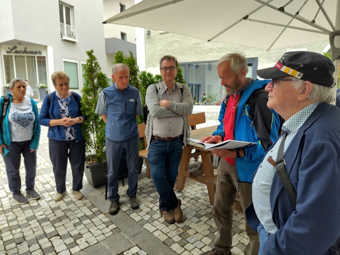 Der Schulmann und Kulturvermittler Wilfried Stimpfl gab uns am Hauptplatz weitere Informationen zur Kultur- und Baugeschichte von Laas. Der Südtiroler Autor N.C. Kaser hat seinerzeit kurz in Laas kurz unterrichtet und seine Impressionen zu Laas in ein Gedicht gefasst hat. Herr Stimplf las es uns vor.