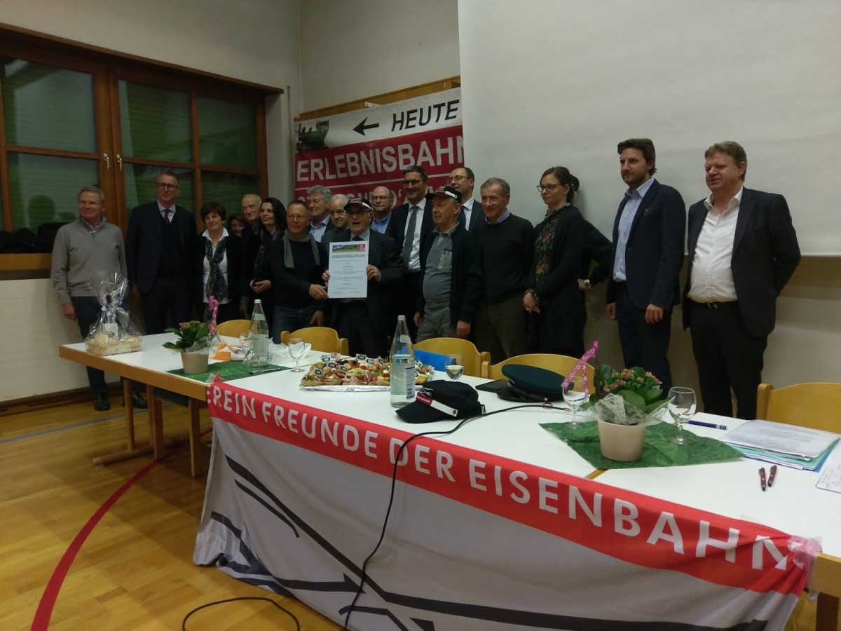 Hannes Guggenberger vom Verein Gailtalbahn in Kärntnen dankte dem Präsidenten Walter Weiss für seine Unterstützung in Form eines Vortrages, den er in Hermagor gehalten hat - und überreichte ihm eine Urkunde. Anschließend sei der Verein gegründet worden, der sich für die Wiederinbetriebnahme des mittlerweile aufgelassenen Teilstückes von Hermagor nach Kötschach-Mauthen einsetzt. Die Strecke wird nicht abgebaut und ist zur Zeit mit Draisinen befahrbar, ein Betrieb mit Zügen ist auch noch möglich.