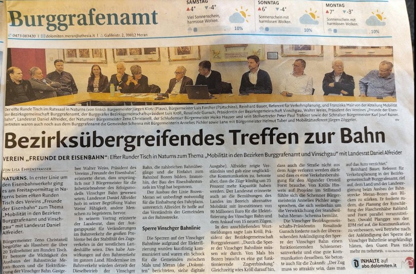 Ende November fand in Naturs der Runde Tisch zum Thema Mobilität in den Bezirekn Burggrafenamt und Vinschgau statt. Die Zeitung "Dolomiten" berichtete ausführlich.