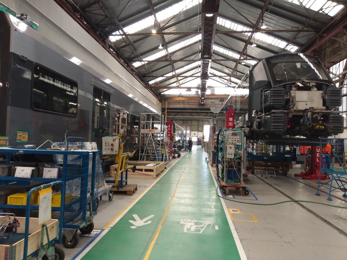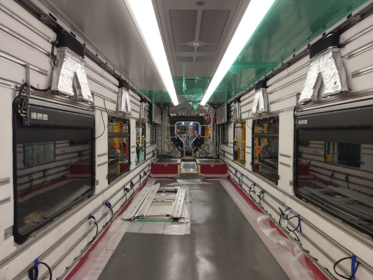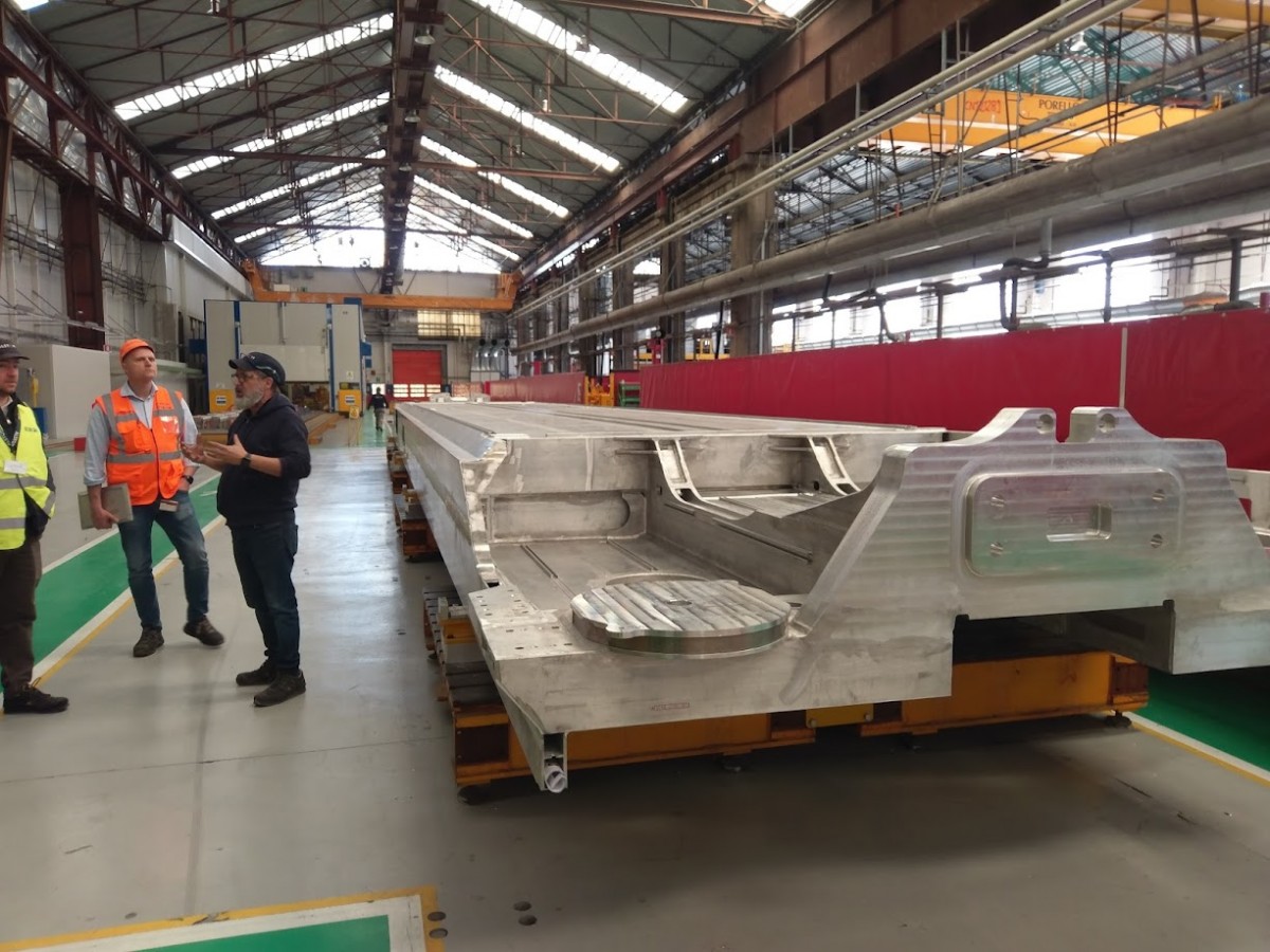Und nun begann die interesante Führung durch die Werkhallen. Ausgehend von jener Station, wo die Alluminiumplatten zusammengeschweißt werden, erleben wir, wie Schritt für Schritt die Waggonbasis, die Wände und die Dachformation entstehen. Wie uns ein Werkleiter erklärt, fließen bei diesem Prozess eine Menge technische Überlegungen mit ein. Was Sorgen macht, sind zur Zeit Lieferschwierigkeiten aufgrund der Krise im Roten Meer. Auf uns macht die ganze Produktionslinie einen äußerst professionellen Eindruck. Auf den folgenden Stationen werden alle nur erdenklichen Komponenten eingebaut. Die passgenaue Bereitstellung der Elemente ist eine logistische Meisterleistung. Es gibt zudem ausgeklügelte Überprüfsysteme, um z.B. zu testen, ob die weitverzweigte Verkabelung korrekt erfolgt ist.